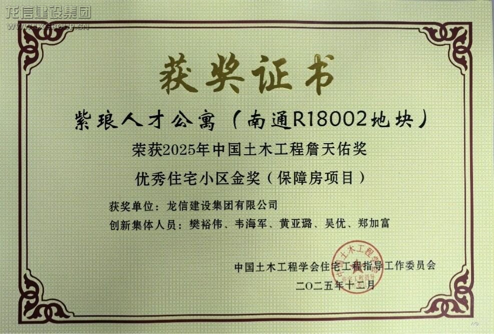 12月27日,2025年中國(guó)土木工程詹天佑獎(jiǎng)優(yōu)秀住宅小區(qū)技術(shù)交流會(huì)在北京召開(kāi)。由龍信建設(shè)集團(tuán)承建的紫瑯人才公寓(南通R18002地塊)項(xiàng)目榮獲2025中國(guó)土木工程詹天佑獎(jiǎng)優(yōu)秀住宅小區(qū)金獎(jiǎng)。